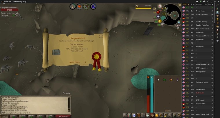 With the Barcrawl done I could finally complete Horror from the Deep. I prepared as many Swordfish as I could hold and went to take the two Dagannoths down. The Baby was more difficult than the Mother as I couldn’t get it to safespot, but it only took me one attempt to complete the quest.