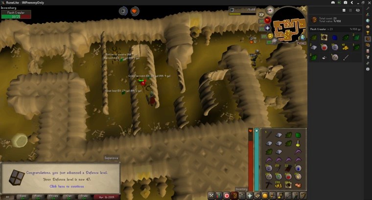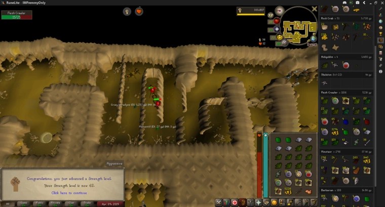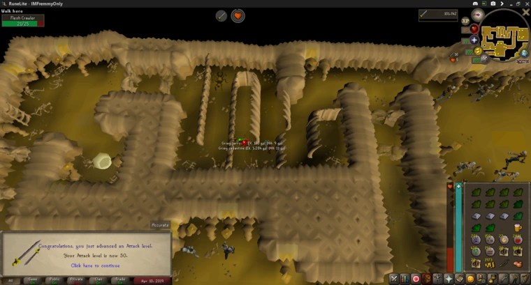 From the occasional AFKing at Rock Crabs and the Flesh Crawler grind, I hit 50 Attack, 62 Strength, and 47 Defence. I also got from 4-10 Herblore by cleaning Guams and Marrentills that the Flesh Crawlers dropped, though most of those levels were on mobile.