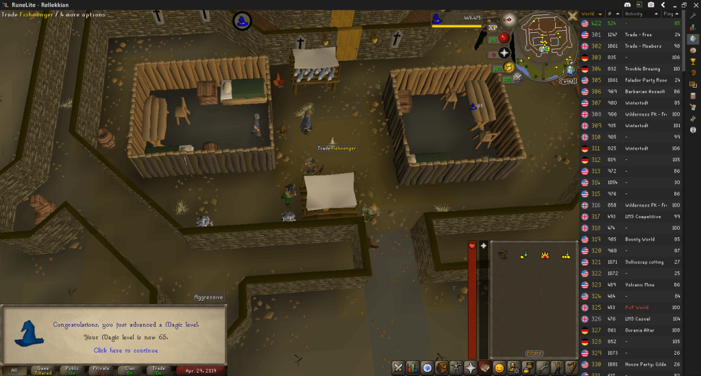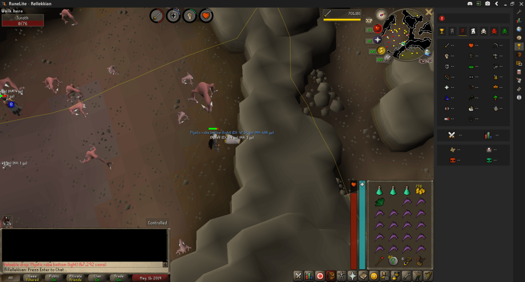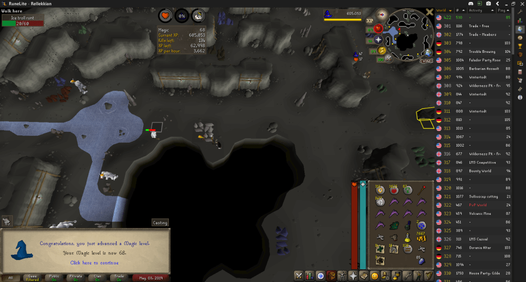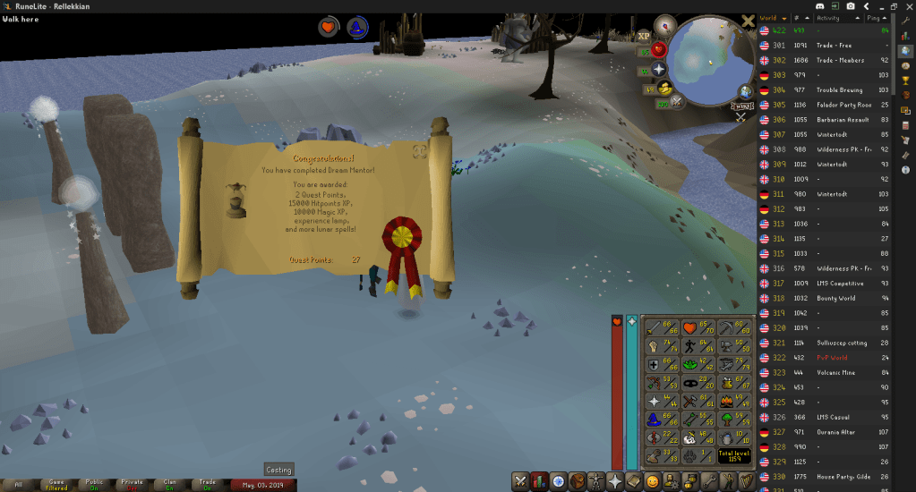 Since 65 Magic was a requirement for Lunar Diplomacy, NPC Contact requires 67 Magic, and my boy Jossik at the Lighthouse sells Wizard’s Mind Bombs, I jumped onto the normal slayer train almost immediately. This netted me a few Slayer levels and also Combat Levels which were the next goal, as Dream Mentor has a strict 85 Combat requirement.