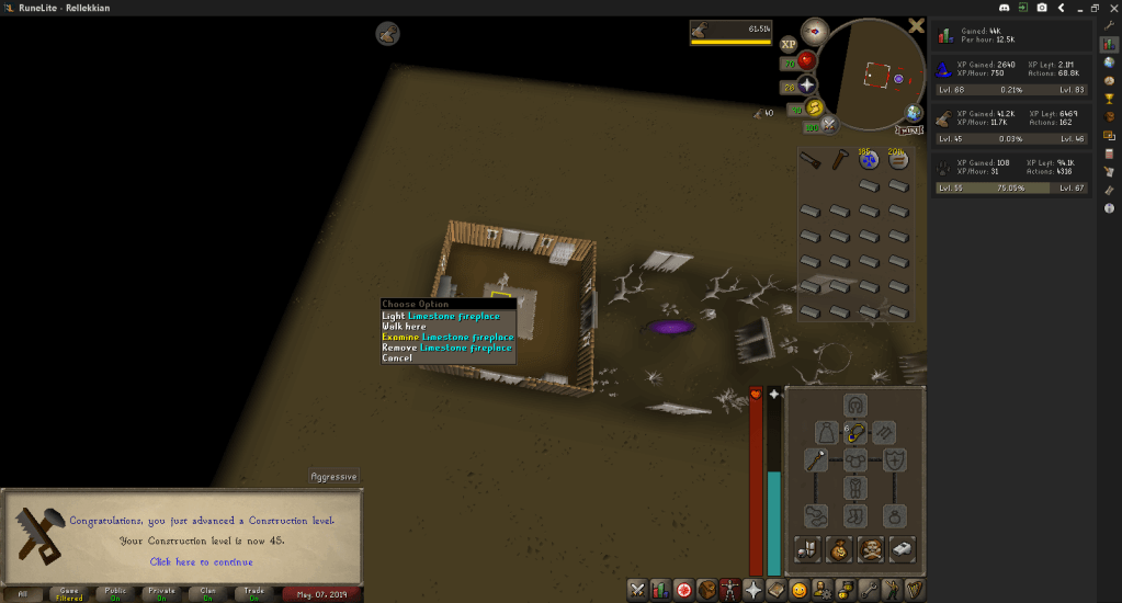 While looking at Construction training methods, I discovered that the Stonemason in Keldagrim sells Limestone Bricks. I jumped right on buying enough bricks to hit 45 Construction so I could build a Chapel and Oak Altar in my house, along with Tool Store 4 and Oak Shelves 2. Having an Altar in my house certainly makes combat a lot nicer since I can pray all the time now.