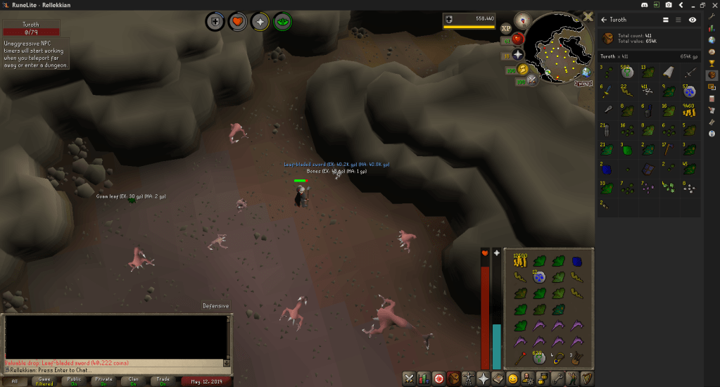 I got pretty lucky, not gonna lie. I got a Light Mystic Bottom drop at 41 KC, many usable herbs, 3 Snapdragon seeds, a pretty nice stack of Nature runes, and 70 Attack. At 411 KC I got that juicy Leaf-Bladed Sword drop, and while I was finishing up that inventory, I got another Light Mystic Bottom.