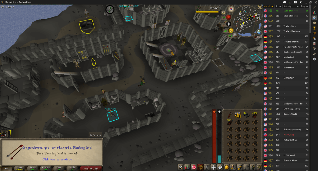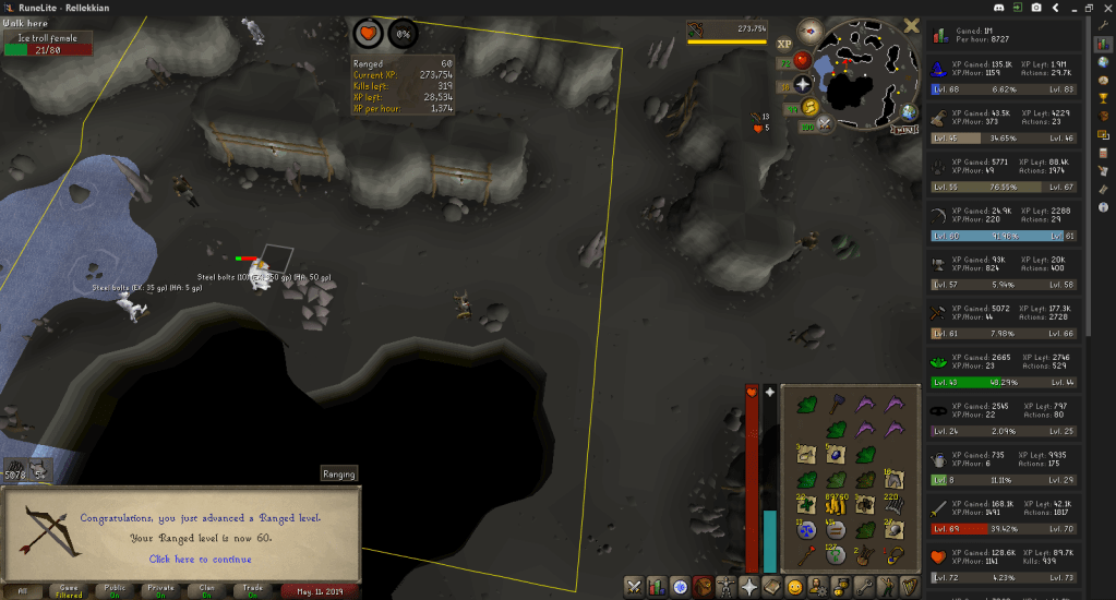 I started by grinding Barbarian Spirits in the Ancient Cavern to get a Yew Shortbow, and then I went for 61 Fletching to make an Adamant Crossbow with parts I could buy at the Keldagrim Crossbow Store. I also made the sweet discovery that there are no bots to compete with for ores at the Jatiszo Ore Store on 1250+ total worlds, and that Mithril Ore from the Blast Furnace store is fairly affordable vs the time it takes to mine.