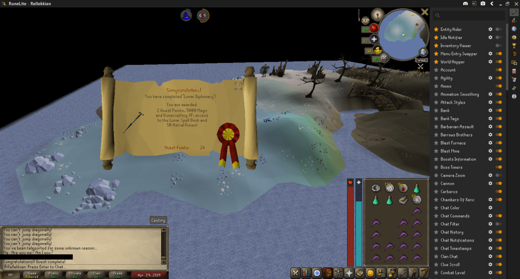 I then started and completed Lunar Diplomacy. The hardest part about the quest was running to the Abyss four times from the Corporeal Beast cave while carrying a few Draman/Partial Lunar Staves.