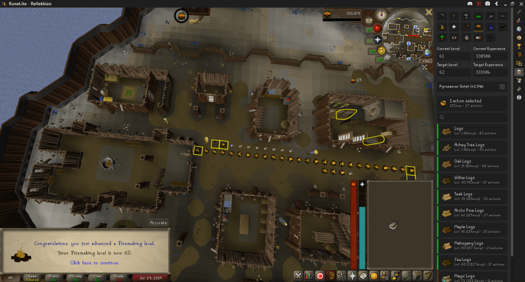 I decided Firemaking was a rather quick skill to gain levels in so I cut quite a few Arctic Pine Logs, hitting 71 Woodcutting and obtaining enough logs to get 62 Firemaking.