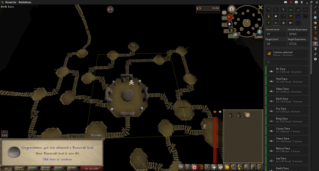 I sucked it up and made the leap to do Runecrafting, hitting 40 and then 44. A trip involved teleporting to the Corporeal Beast cave and making my way to the Abyss. To get to 35 I did 37 trips to the Cosmic Altar, 35 to 40 was 50 trips to the Chaos Altar. After 40 I just crafted Astrals.