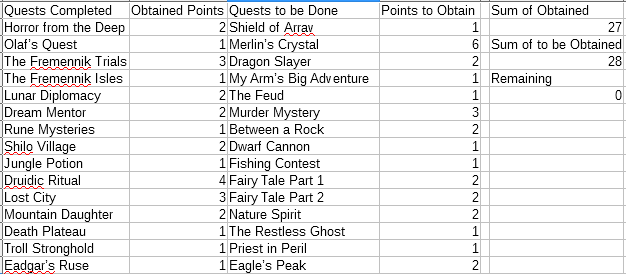 As noted before, the major problem that the quest brings is the Heroes’ Quest requirement and the 55 quest point requirement that it has. Luckily the quests required for it and the Fremennik Diary quests bring me close to the required amount and a few extra quests close to the region tie up the rest, leading to this list of quests I will complete/have completed to meet those requirements.