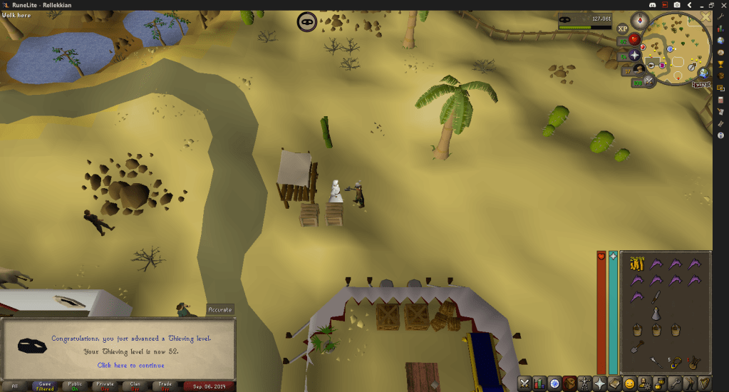 The other requirement for My Arm’s Big Adventure was The Feud, which was a quick and fairly painless quest to complete, despite it being in the desert and only tangentially related to the overall theme. From the experience reward of The Feud, I hit 52 Thieving.
