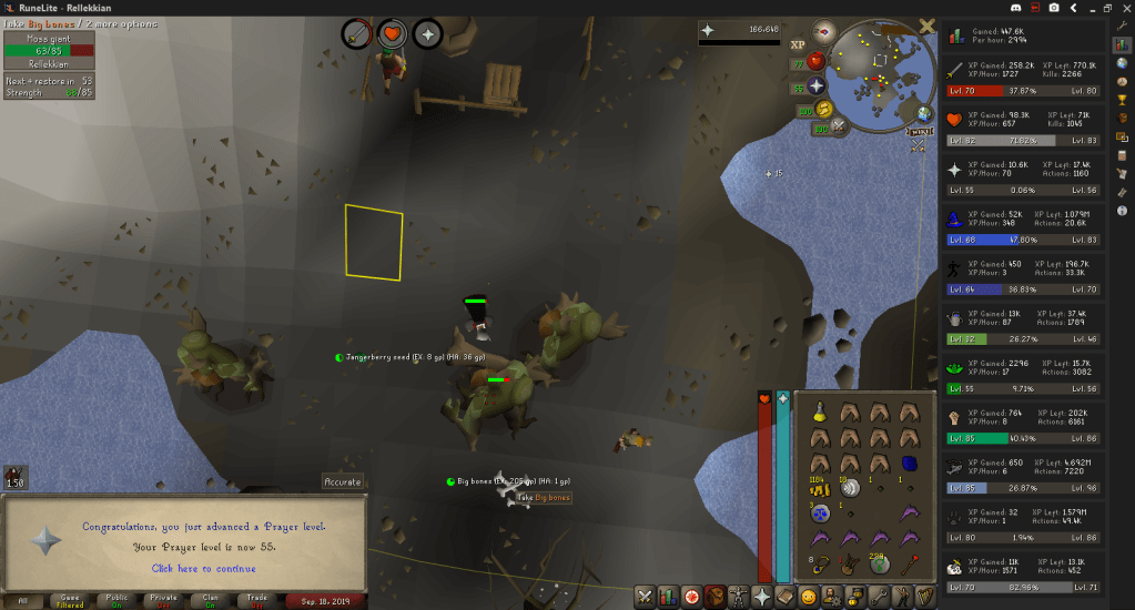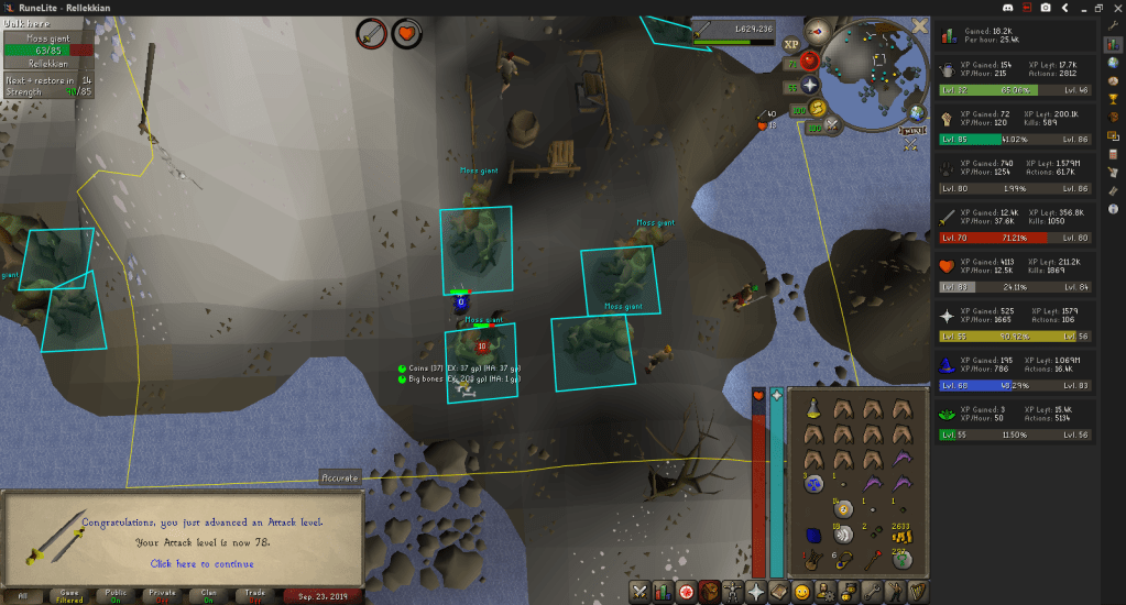 Started off the week killing Moss Giants and Mammoths to hunt for herb seeds and bush seeds. While doing so, I hit 75 – 77 Attack (76 and 77 were on mobile unfortunately). This was actually bad at the time because I out-leveled the aggression range of Moss Giants and lost an AFK training method. Seeing as most of that was on mobile my kills dropped because I was at work. Still managed to gather enough seeds for my goals, though.