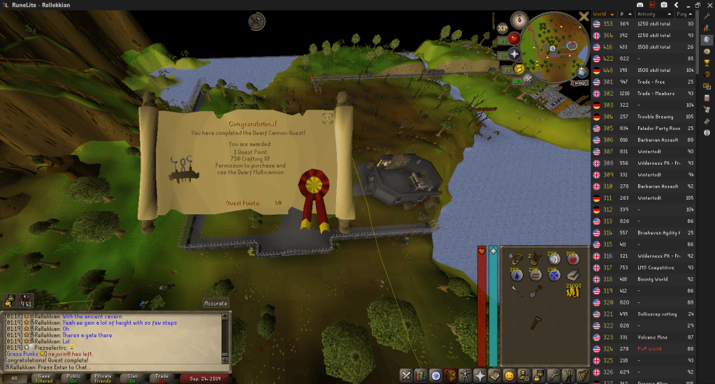 After finishing up Merlin’s Crystal, I went to do most of Fishing Competition to the west. As Dwarf Cannon was nearby, I picked that up and completed the parts in that area as well.