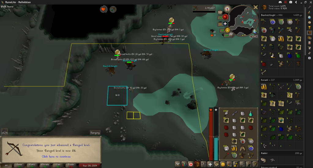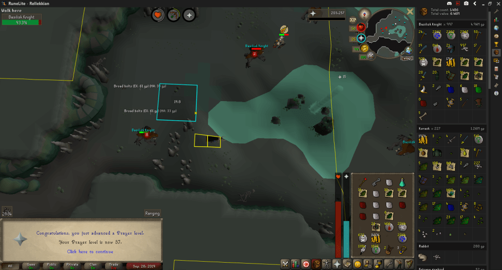 As stated at the end of my last log, I continued killing a lot of Basilisk Knights, hitting 84 Ranged and 57 Prayer.