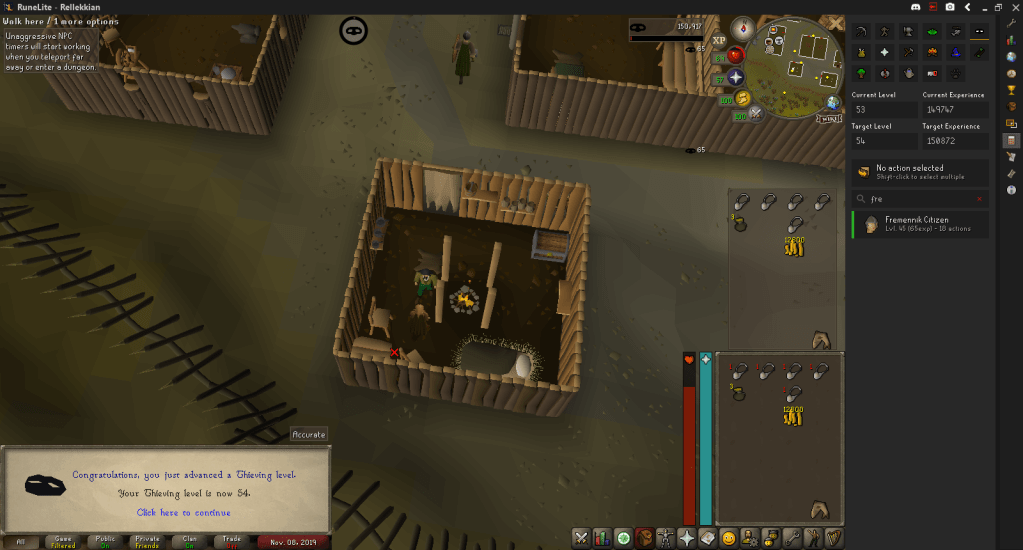 To steal from the Keldagrim Gem Stall I’ll need 75 Thieving, and I’m at 54. To get to 75, I’ll need to successfully pickpocket Fremennik Citizens 16,300 times. Since they have a Talk-to option, that’s going to be a real pain. Two-tap mode on mobile works out pretty alright though.