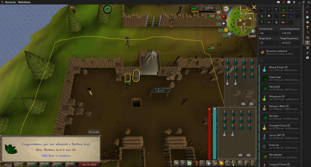 Cleaning all those herbs got me to 61 Herblore and then making Prayer Potions with the Ranarrs almost put me to 62, and as a reminder the goal is 65.