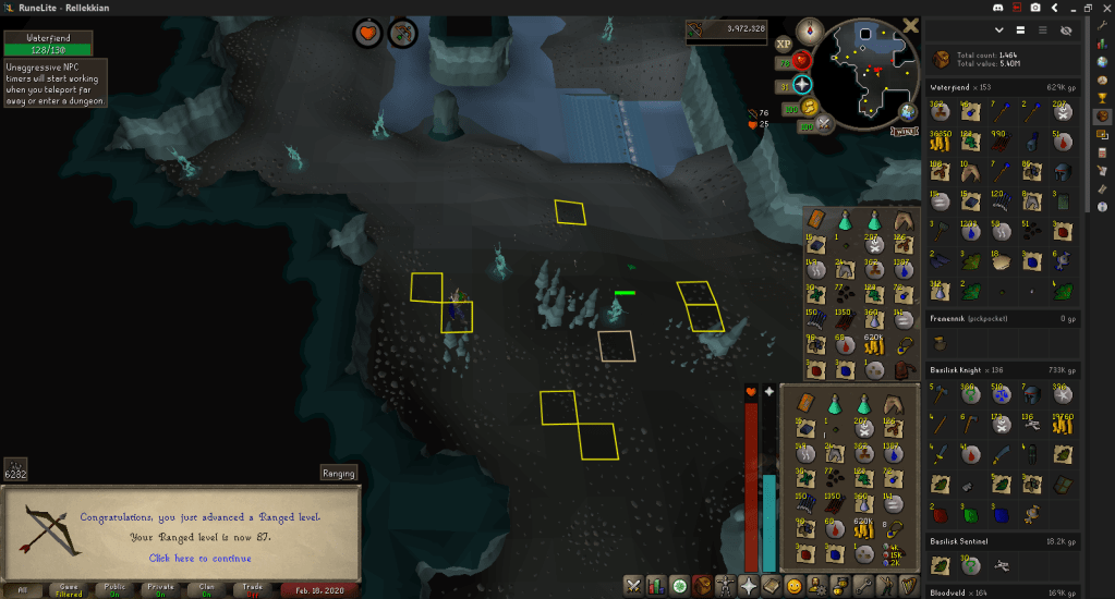 One of the things I was thinking about in my quest of things to AFK was Waterfiends in the Ancient Cavern. I learned from a similar snowflake how to do it and it’ll be a nice source of Range experience and decent loot. During a trip, I hit 87 Hitpoints and 87 Ranged (The inflated cash stack was from me alching the Green Dragonhide Bodies from before while I was waiting for the aggression timer).