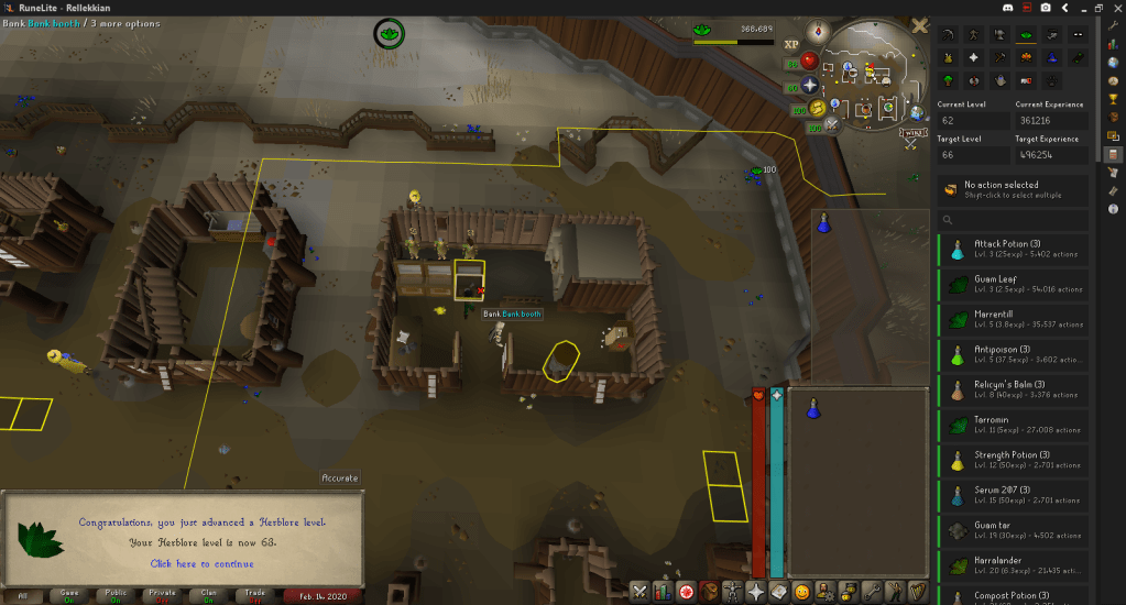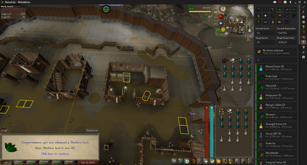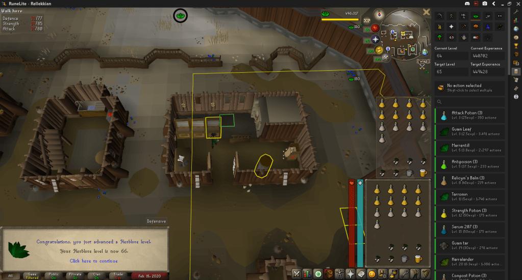 Afterwards, I boosted to 66 for a bit and used up a bunch of the stored materials for Super Defence Potions and hit 66 Herblore.