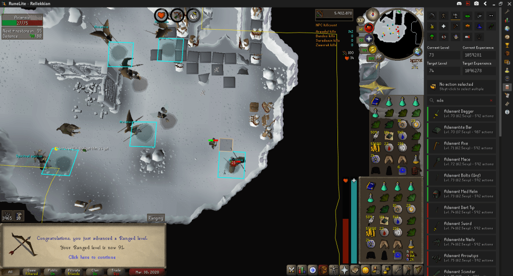 Got 91 Ranged from an Aviansie task, as well as the final amount of Adamant Bars to get another Smithing level when I feel like it.