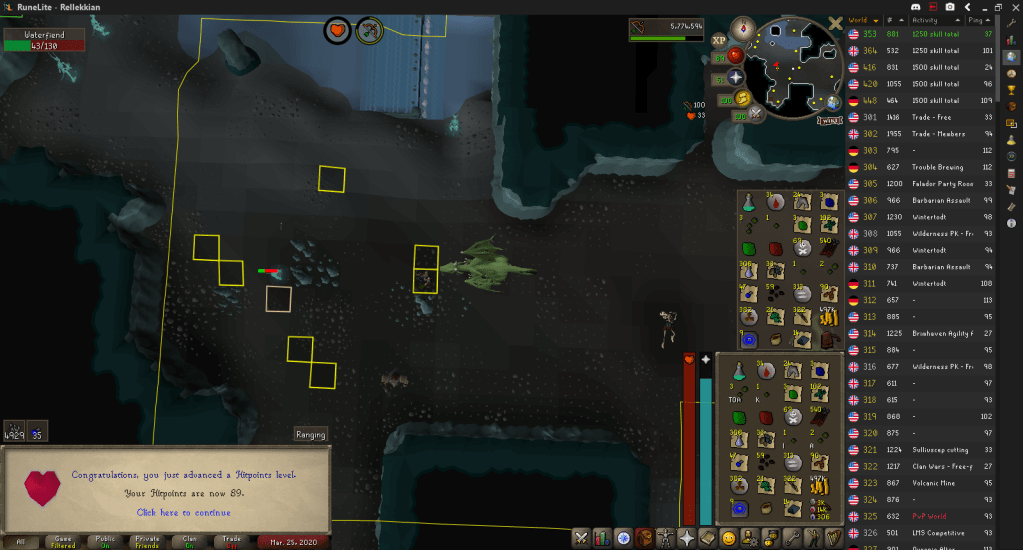 I also picked the wrong time to have the desire to try to catch Dragon Imps what with the world hop timer, so that’s kinda killed my motivation to do things. It also affects my ability to hop around for runes and ores so it limits that facet of training too. Really shows how much I rely on world hopping, haha.