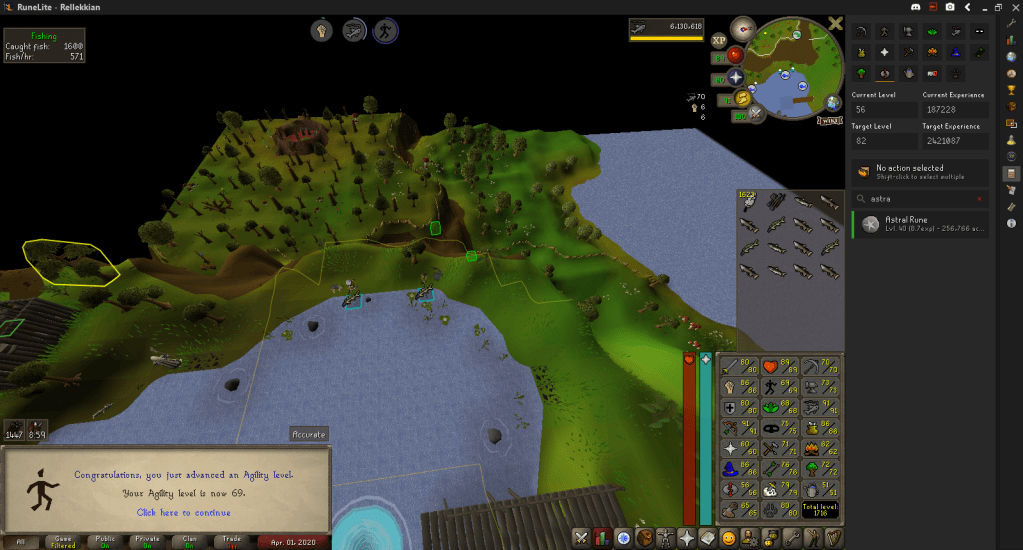 I’ll probably be AFK fishing for a while, perhaps adding some Ankou killing for magic XP and rune gathering depending on how things hold my interest as well as how things progress during this pandemic.