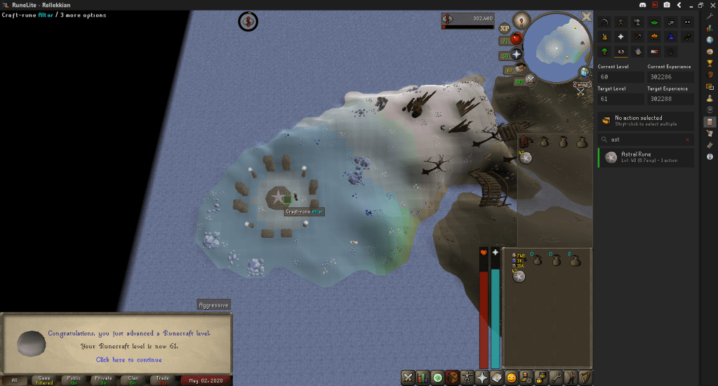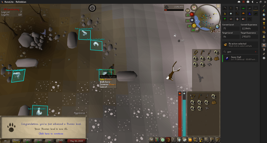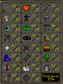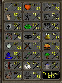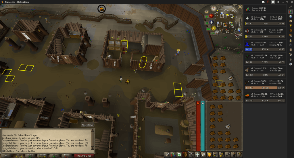 I then finally bit the bullet (only because I ran out of other easy levels) and burned more logs, hitting 70 Firemaking and 1750 Total Level.