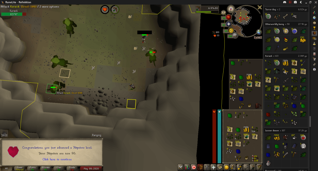 While it was distracting me from writing this log, I was close to another Hitpoint level so I ineffectually multitasked until I hit 90 Hitpoints.
