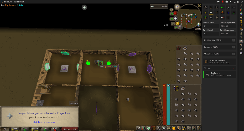 While training Prayer on my alt I decided it probably wasn’t a bad idea to do the same on this account. I offered the few Dagannoth Bones I had at the Chaos altar (Thanks Deadman Mode!) and used a few Big Bones I had at my POH Altar to hit 62 Prayer.