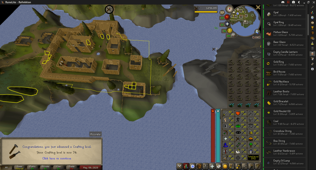 I hit 74 Crafting from most of the Flax I had, allowing me to craft Dragonstone Bracelets (and thus Combat Bracelets), should I ever find a damn Dragonstone. As a continuation of the AFK activity, I spun the rest of my Flax, putting me pretty close to 75, which is the level for Slayer Rings. I would have used Spin Flax but due to previous training I was pretty low on Nature Runes