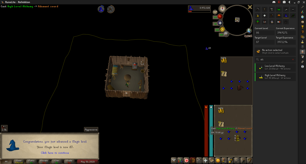 A few trips around Blast Furnace to turn the ore I had collected into bars, combined with previously collected bars and several draughts of Dwarven Stout, got me to 74 Smithing. This opens up a new (unboosted) money making method via Aviansies, Adamant Bars, and high-alching smithed Adamant Swords.