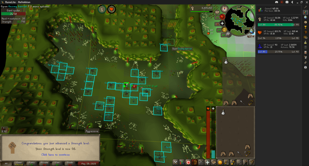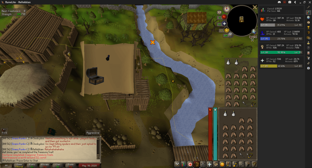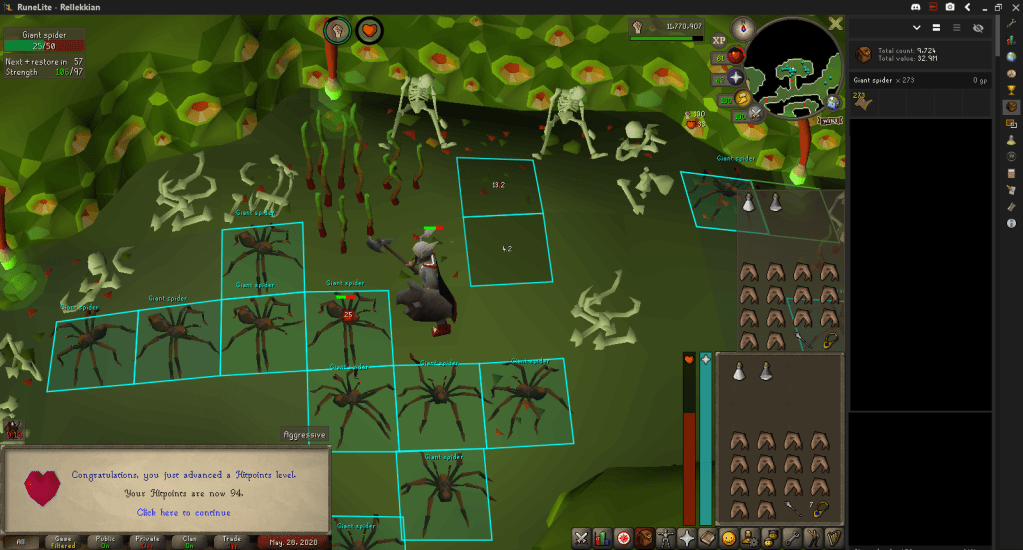 I ended up killing around 48,000 – 49,000 Giant Spiders, getting 300 or so Beginner Clues. Every time I got the Barbarian Village step, I ran up the Stronghold to do it, hoping for a one-step clue.