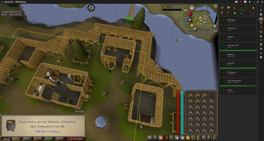 To replenish the Sharks I used for the 99 Strength grind, I switched over to fishing, finally cooking them today and also hitting 88 Cooking