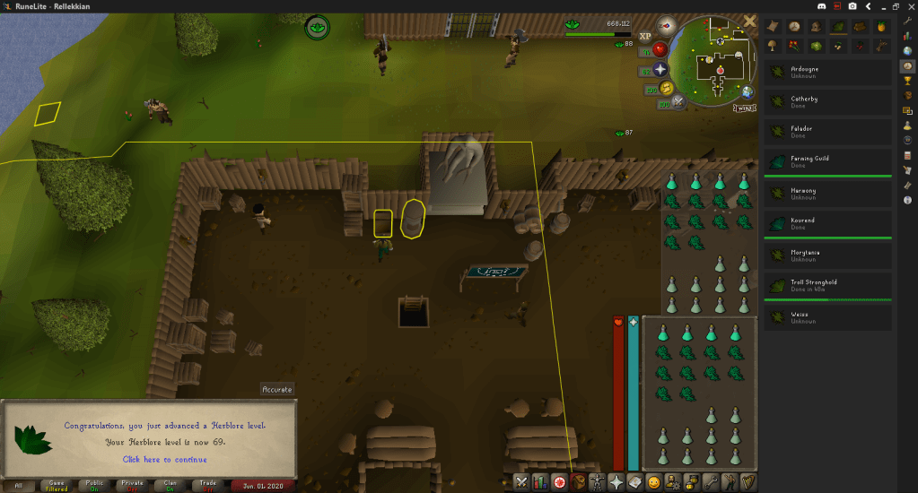 To kill more time, I used a buncha herbs and hit 69 Herblore. With some more Kingdom Management, I now also have the herbs to hit 71 Herblore, where I can boost to make Range Potions, which will help with many many things in the near future.