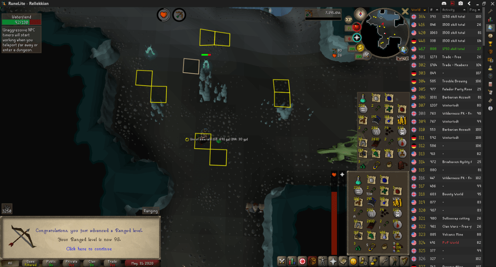I decided to AFK Waterfiends for their crafting drops, hitting 93 Ranged while doing so.