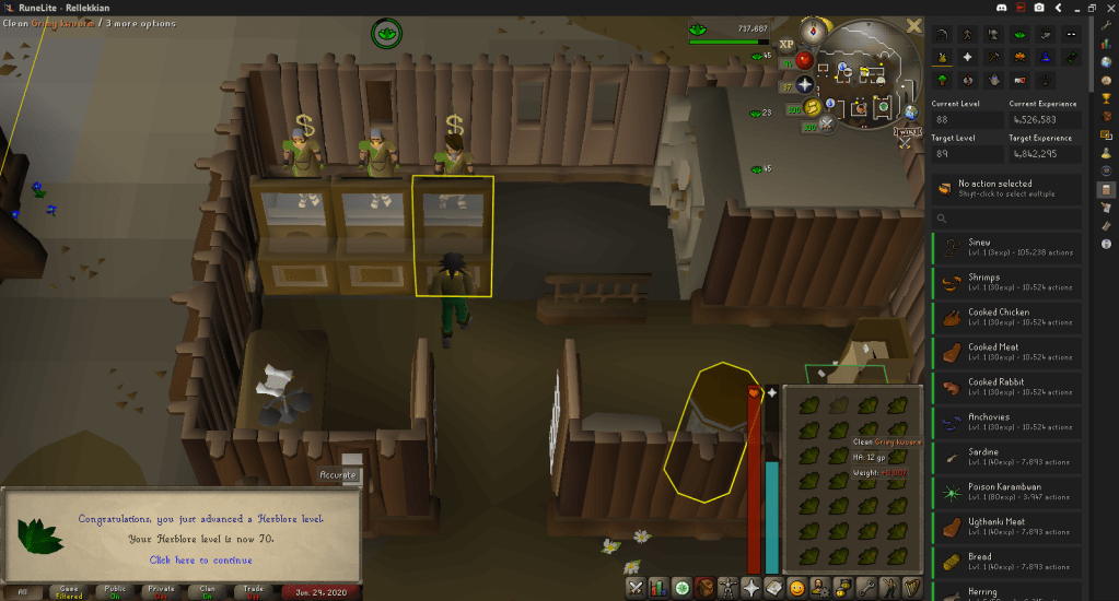 I decided to clean the herbs that had piled up, and from that I hit 70 Herblore, unlocking the ability to clean Dwarf Weeds, which gave a decent chunk of experience. I then made some Prayer Potions and Super Defence Potions, since those are the easiest to straight up make, and I’m pretty close to 71 now.