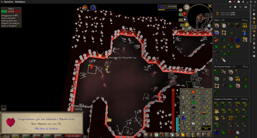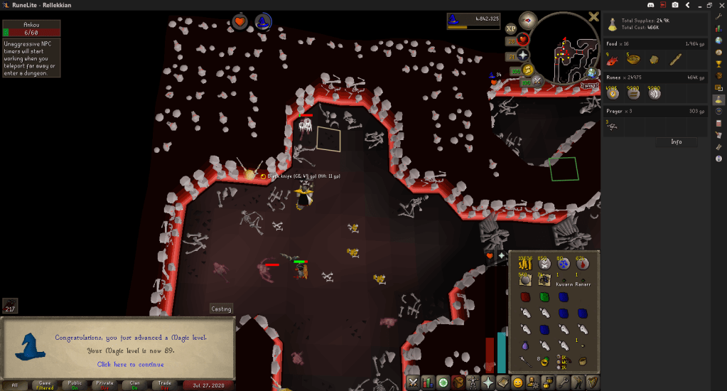 I got a Dagannoth task and wanted to beat up Rex, but I was lacking the Death Runes for it. I had Chaos Runes stocked up for some Ankou murdering so I spent a bunch of them there for their Death and Blood Rune drops. In doing so, I hit 95 Hitpoints and 89 Magic. I think I’m done relying on Magic Dart for Rex kills, just because I don’t want to have to wait for a Dagannoth task to kill him, and I also don’t want to have to wait till I get enough Death Runes to do so. I will still most likely use Magic Dart on task if I have the runes for it, but I will probably downgrade to Fire Bolt in general since it would be cheaper, and quicker, to obtain the runes for it.
