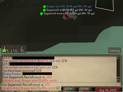 I did get 2 Dragon Axes, though, which is pretty nice. I haven’t considered how I want to use the axe though, being a tossup between Oak Logs for Planks and Plank Make in front of Barbarian Assault or the Yew Tree by Otto’s house for Fletching and Alching.