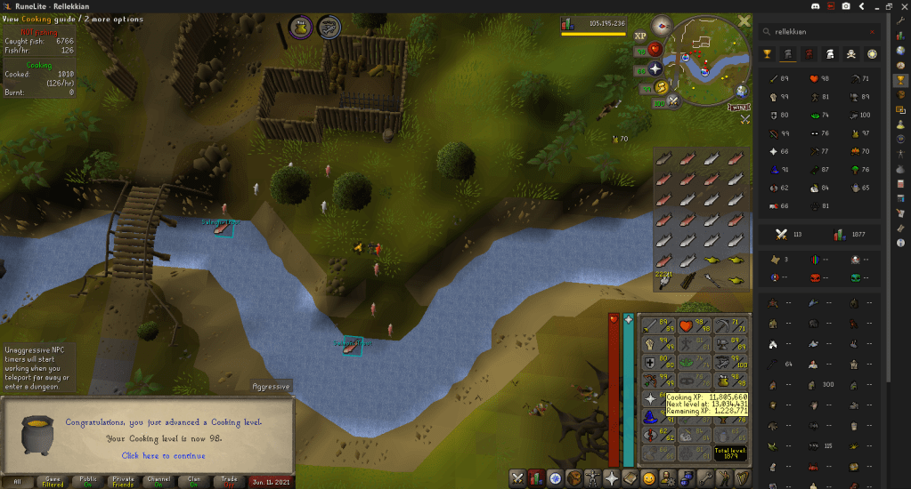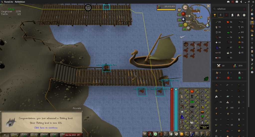 A friend of mine was disgusted at what I was doing and threatened to delete a bond if I didn’t take it, so I accepted it and went to Rellekka to catch Lobsters to finish up 99 Cooking, where I hit 101 Fishing