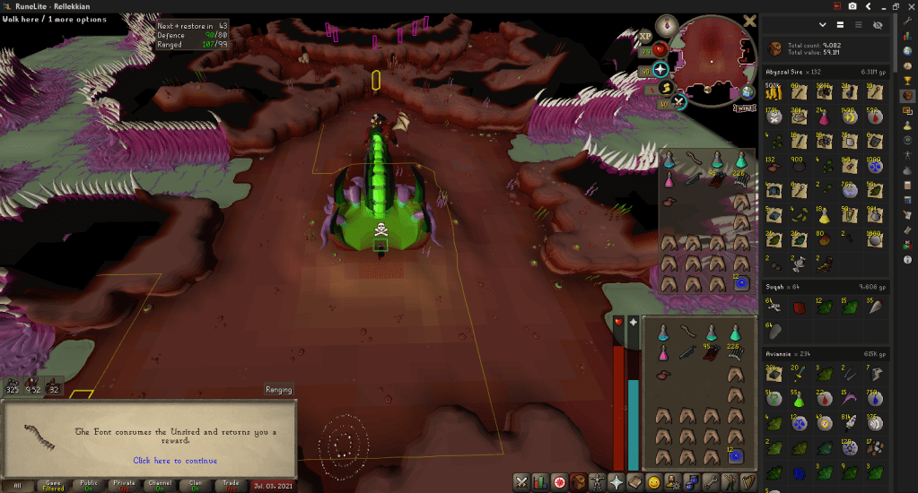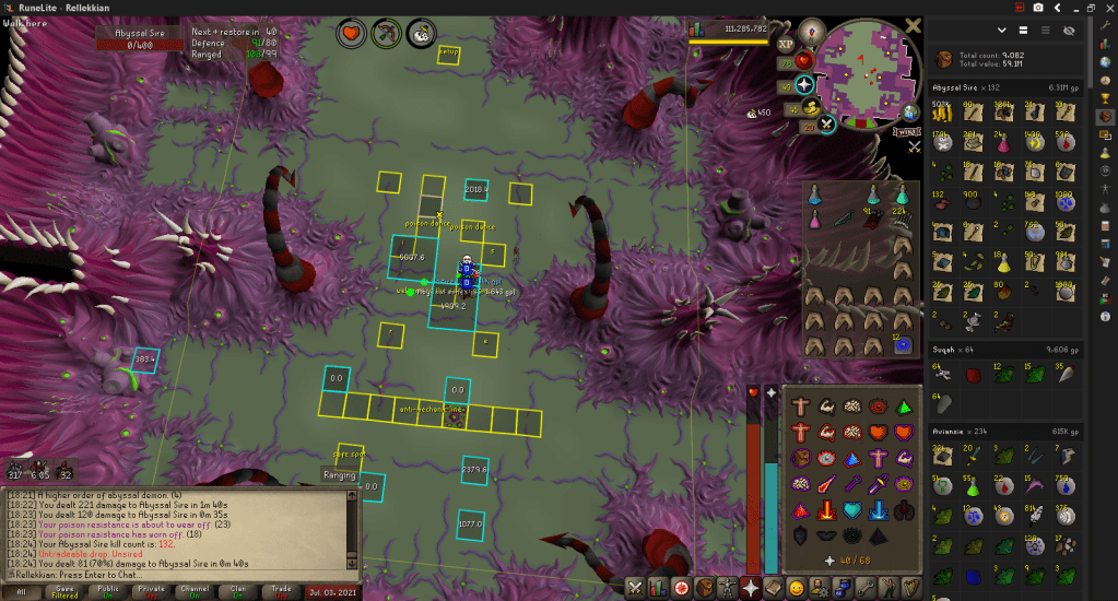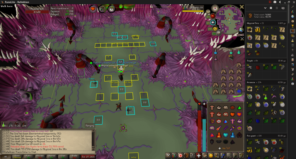 Phase 1: I run from the Edgeville Glory teleport to the Zamorak Mage and enter the Sire Arena via the Abyssal Runecrafting area. I wake up Sire, wait until I can damage him, then shoot him until I do 75 damage to him, which stuns him. Then I rush to kill the respiratory systems, making sure to only kill 3. Then, I teleport out and restock, return to the arena, hope I wasn’t crashed, kill the 4th system, and begin phase 2.