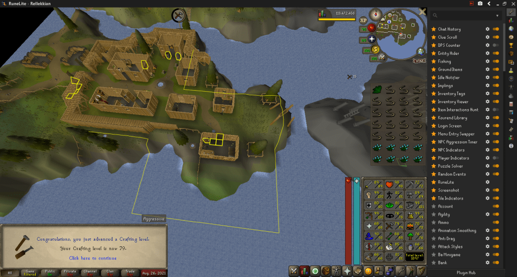 After a long break, I came back to hit a total level milestone. I finished off 63 Runecrafting, and then spun bowstrings for 79 Crafting. 79 Crafting also allows me to make Black Dragonhide Vambraces, which ends the era of Red Spiky Vambraces.