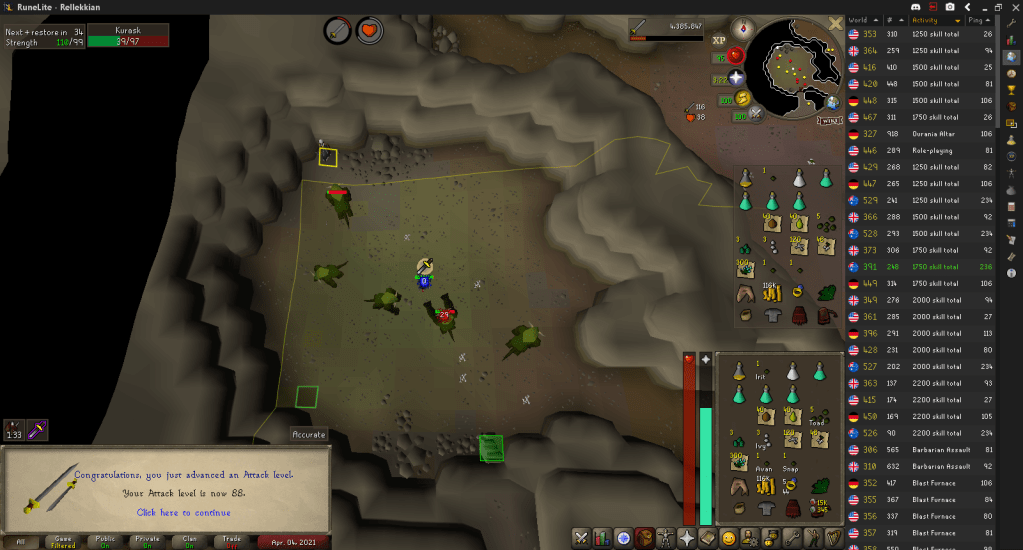 Herblore, being a very useful skill, has always been something I’ve been working on. While killing Kurasks for supplies for that, I hit 88 Attack.