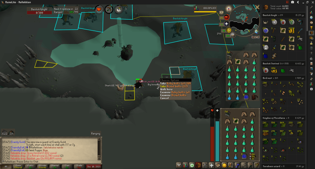 The next issue I wanted to solve was ammunition. Rune bolts did wonders for damage, but they’re not easy for me to accumulate mass values of (Without spending a lot of time in LMS, which I’d rather not do). Diamond bolts also helped a lot, but diamonds require mining to gather reliable amounts of, which I loathe. Rune arrows aren’t that bad to get, and LMS can give a lot more of those than Rune Bolts (Dragonstone Bolts, really, but they’re essentially the same for this purpose). But they’re still not something that helps to use a lot of all the time. So I decided to only use them in one specific part of the fight, to maximize their efficacy.
