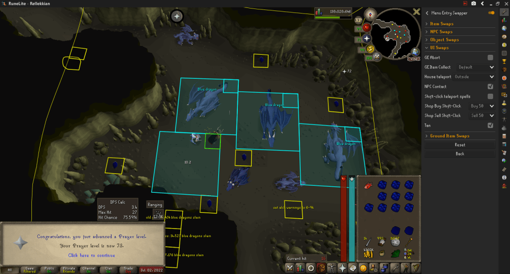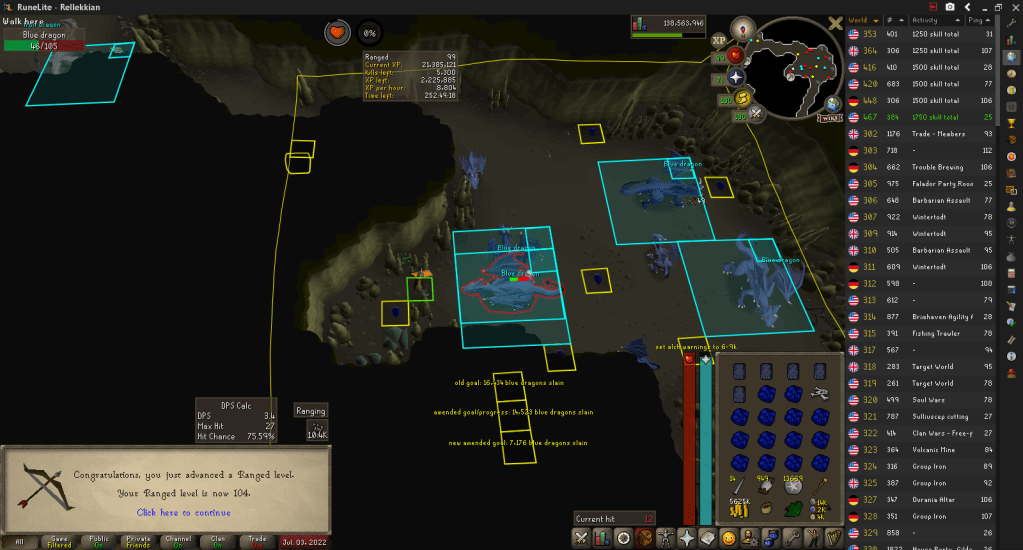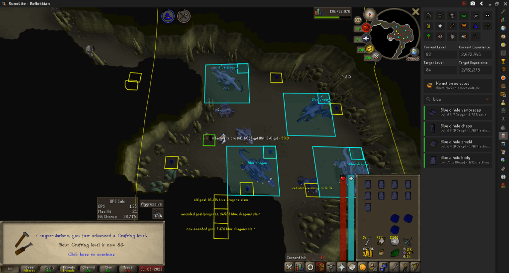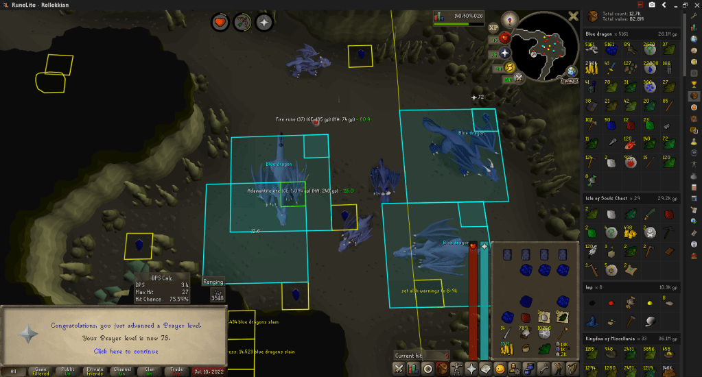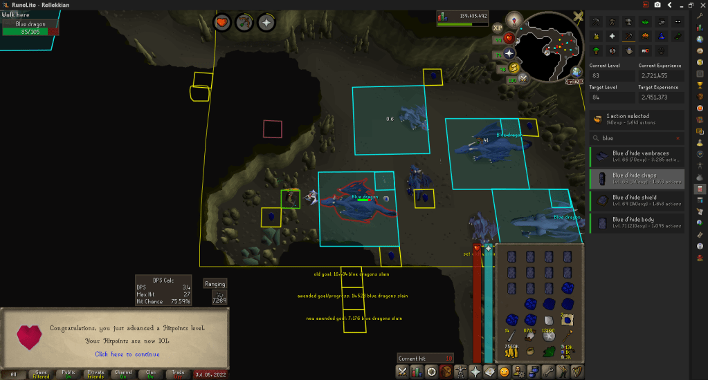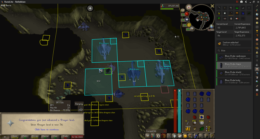 Finally returning to the Blue Dragon grind, I hit 72 and then 73 Prayer, followed by 104 Ranged, 83 Crafting, 74 Prayer, and 101 Hitpoints. I had a work trip after that and didn’t get to do much for a while.