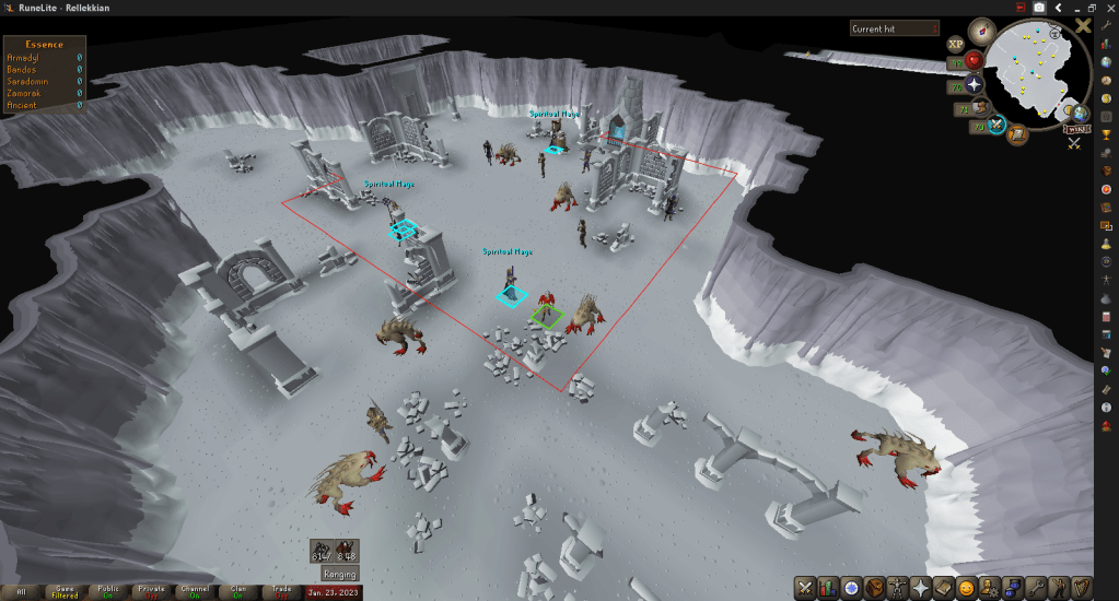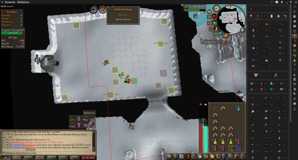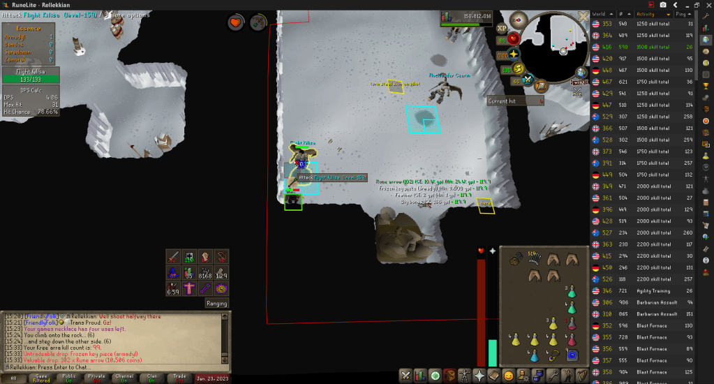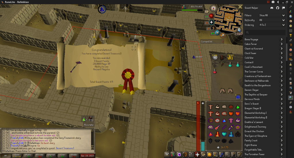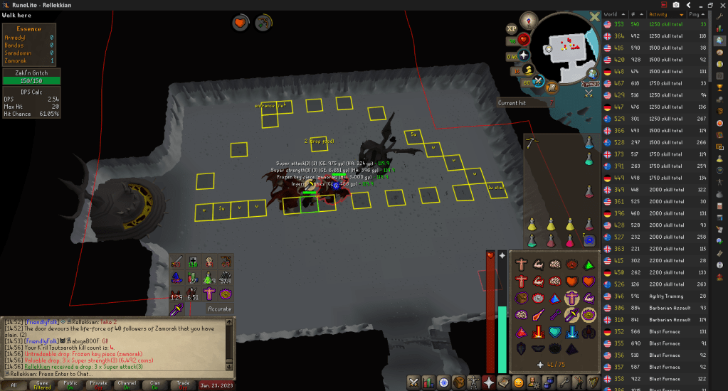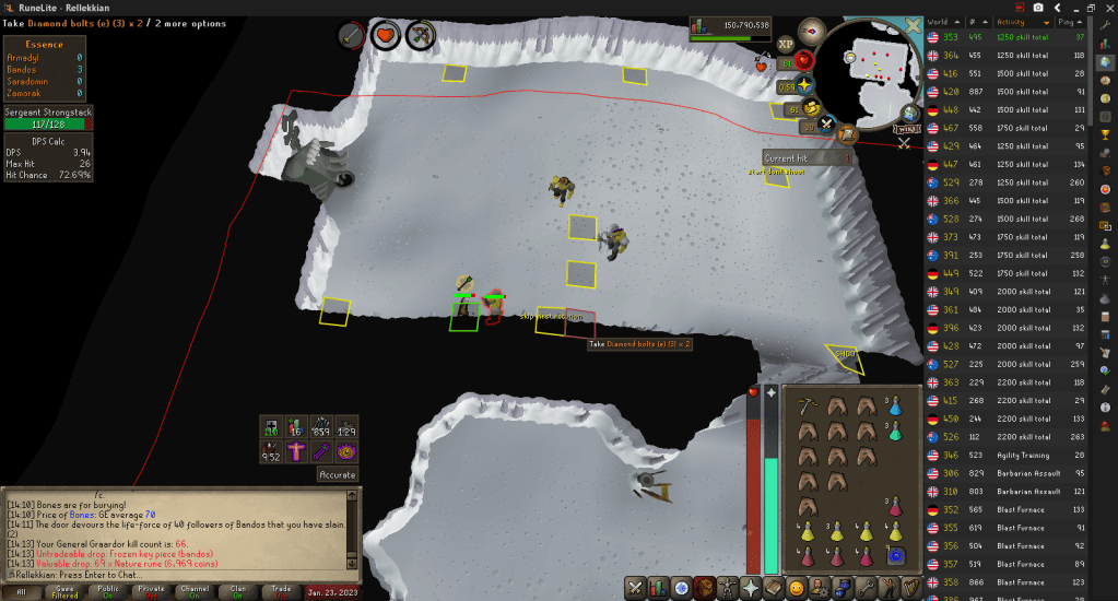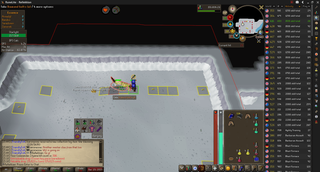 After Desert Treasure was completed, I waited around for the prompt to start the Frozen Door miniquest, and set out to beat up the bosses to get their key pieces. Garage Door, Kril, Zilyana, Kree. Bit rusty on Garage Door so I had to attempt him twice, and Kril beat me up too (and I’ve not really got the method down so…). But I did get the key pieces and unlock the Frozen Prison, where I will spend some time grinding out the drops from the monsters there, and working on my next steps forward.