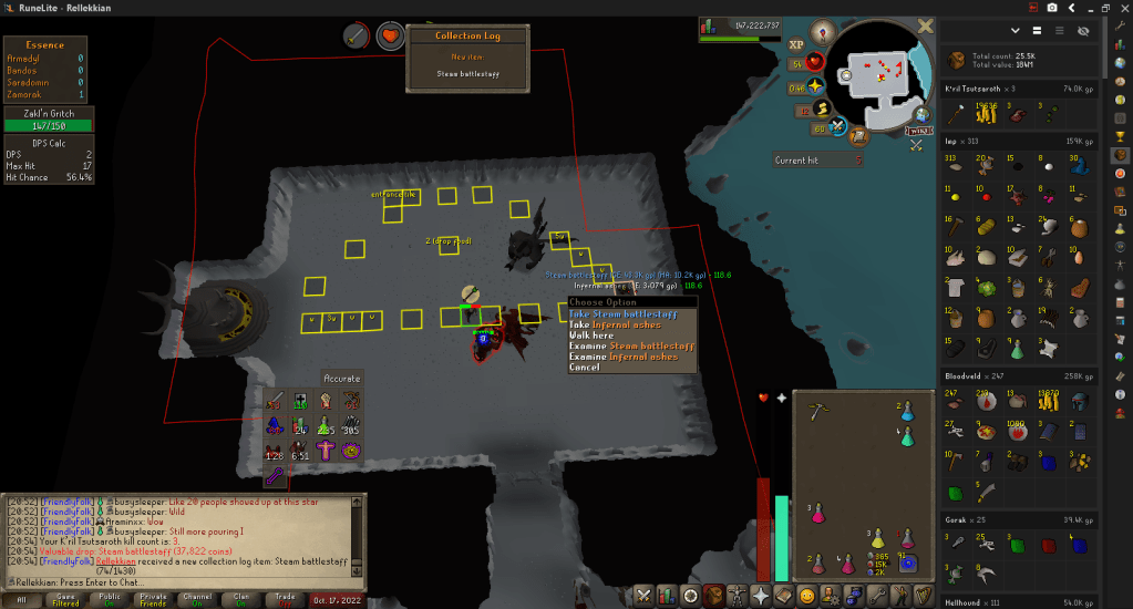 Eager to unlock the Frozen Prison at the time, and armed with the ranged Kril method a friend shared with me, I swapped to Kril. Proving to be a much more difficult time than Zilyana and Garage Door, I was extremely relieved when I got a Steam Battlestaff on my 3rd kill (but like, 10th attempt).