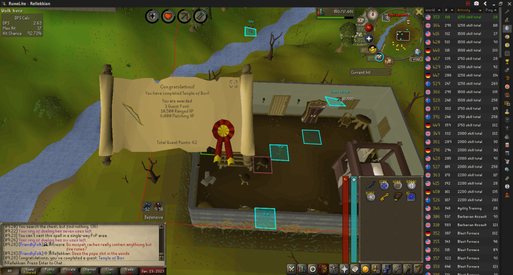 I picked up the Godwars Grind, deciding to just shoot Kree in a corner with my crossbow and pray that I killed the birds before they killed me, and while getting Ecunemical keys for that grind, I hit 150m total experience. I also hit 93 Attack. I also also got a Goblin Champion Scroll which was neat.