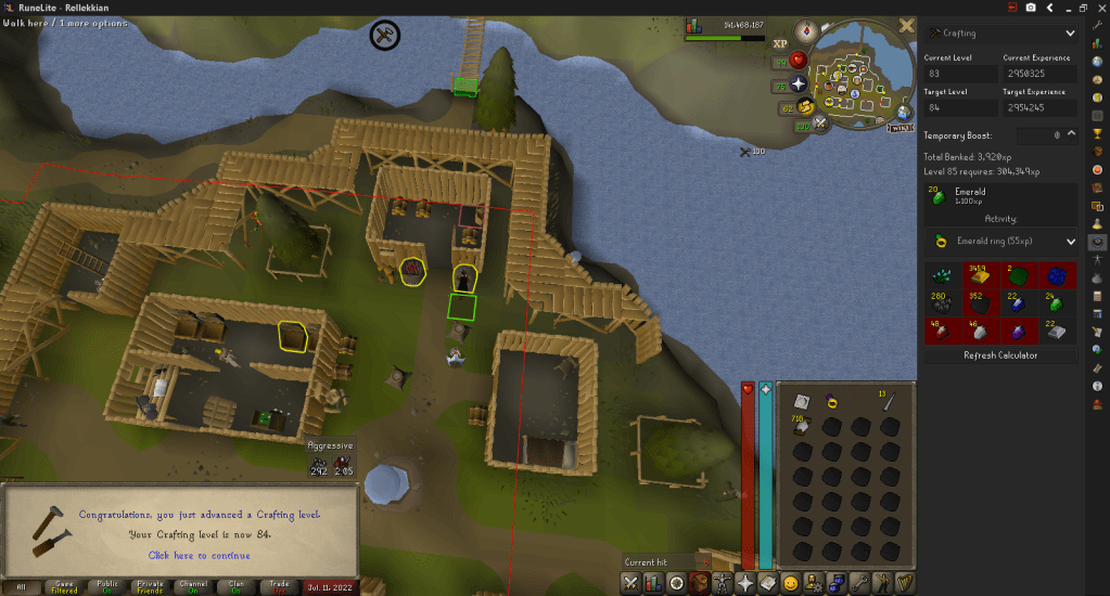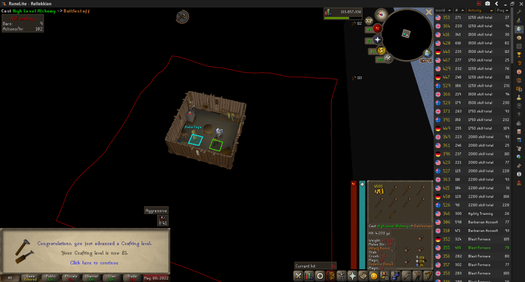 When I was able to focus on the game again, I went back to the dragons and hit 98 Magic, 75 Prayer, and then, finally, 84 Crafting, allowing me to craft Black Dragonhide Bodies.