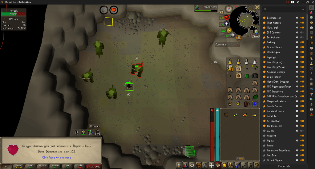 Some boredom/burnout hit and I was just doing things to do things, I hit 102 Hitpoints at Kurasks and trained Thieving, hitting level 78.