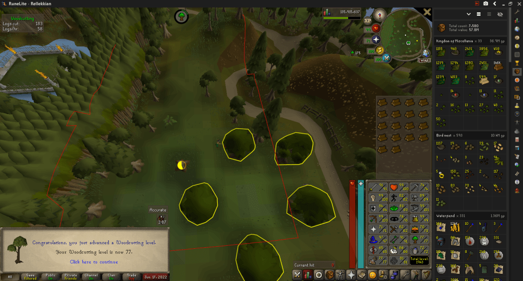 Looking for more fuel for the previous activity, I hit 77 Woodcutting chopping down some Yews.